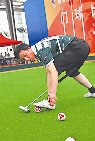5月17日,湖南队队员在比赛中击球。当日,第四届全国体育大会门球项目开赛,在当天下午进行的一场比赛中,湖南队以20比10战胜山西队。本届体育大会门球比赛共有河北、上海、西藏、澳门等26支队伍参加。