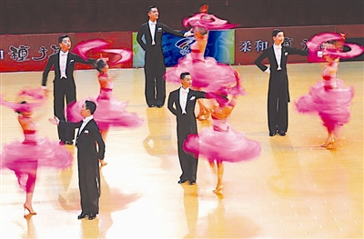 5月17日,北京队选手在团体标准舞比赛中。最终,北京队获得二等奖。当日,第四届全国体育大会体育舞蹈比赛在合肥开赛,选手们身着华丽的服饰在霓虹灯的映衬下翩翩起舞,让观众仿佛置身于梦境之中。 新华社记者 公磊 摄