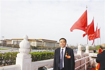 2010年4月26日,进京接受表彰的全国劳模和先进工作者登临天安门城楼。图为于顺德登上天安门城楼拍照留念。