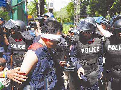 5月19日,在泰国首都曼谷,警察将在军队清场行动中逮捕的一名“红衫军”成员带走。