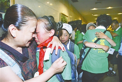 5月20日,在海口美兰国际机场,在海南结束为期一周的“心灵呵护”之旅后,来自玉树地震灾区的孩子们与相伴了一周的工作人员依依惜别,互道祝福。