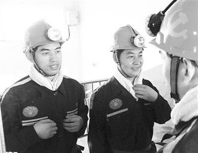 5月18日,淮北矿业集团朔里矿掘进五区三班技师吴文化(左),提出的“增加班组职工收入”的建议,被工会正式备选审议,成为提高职工“体面”系数的头号议案,深受班组职工热捧。5月19日,闻听喜讯的吴文化和工友对着整容镜精心整理工装,精神抖擞地准备上岗。乔时庆 摄