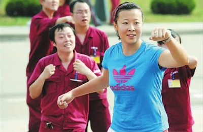 前中国女排队长冯坤(前)在四体会期间与合肥一企业职工共同进行健身练习。