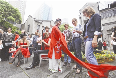 5月22日,上海市月之源新民乐乐团在上海的时尚地标——新天地上演了主题为“东风西韵”的专场民乐演奏与京剧表演,此举旨在让更多的海内外游客了解东方戏剧艺术魅力。新华社记者 陈飞 摄