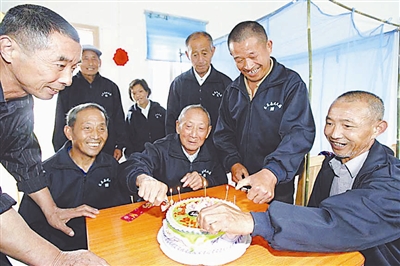 5月23日中午,在安徽池州东至县沼潭敬老院,贺学文(右三)老人迎来了自己86岁生日,院长和其他老人一起为他点燃生日蛋糕上的蜡烛。该院2009年建成,现在有81位孤寡老人,平均年龄72岁,在当地政府和社会的帮助下,他们将在这个大家庭安享自己的晚年。
