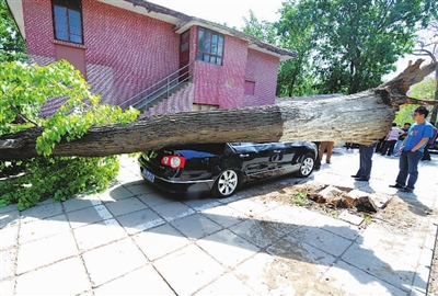 日前,北京海淀区北京理工大学成教学院门前,一棵直径近半米的杨树被大风刮倒,砸中停在树下的黑色大众迈腾轿车。 闻讯而来的车主张女士称,她是学校的在校教师,当天上午刚把车停在树下车位不久,“没想到会出这样的事”。目前,张女士正与校方和保险公司商讨赔偿方案。