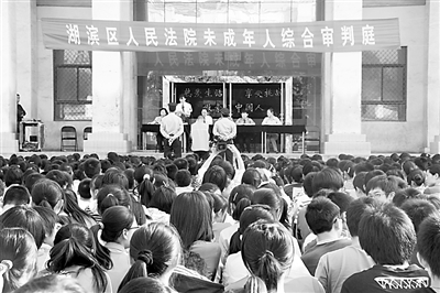 5月11日,河南省三门峡市湖滨区法院在该市外国语中学,对一起抢劫学生案进行公开宣判。短短半年多时间里,该校就有24名学生遭到此案的被告人尤某利用暴力、胁迫手段抢劫。为增强学生的法纪安全意识,该院决定将法庭设在学校内公开审理,以达到最佳法制宣传教育目的。图为法庭开庭现场。