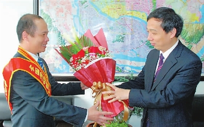 福建省电力公司副总经理、福州电业局局长段志刚向冯振波送上鲜花祝贺他载誉归来 陈德钧 摄