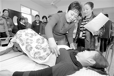 浙江省上虞市一名养老护理员在进行护理操作。不久前,该市养老护理国家职业资格考试开考,60名专业养老护理员参加了笔试和技能考试。 韩坚 摄