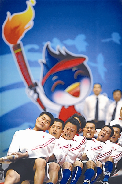 5月25日,山东队队员在比赛中全力拼搏。最终,在男子640公斤级决赛中,山东队以2比0战胜辽宁队获得一等奖。当日,在安徽合肥进行的第四届全国体育大会拔河比赛结束了所有项目的比赛。
