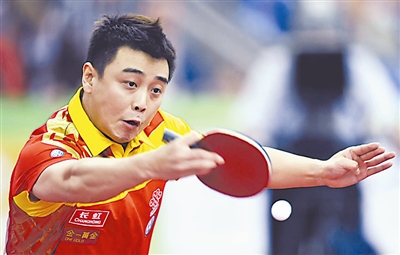 5月25日,中国队选手王皓在比赛中回球。他以3比0击败希腊队选手帕帕吉奥格斯。当日,在2010莫斯科世界乒乓球团体锦标赛男团A组比赛中,中国队以3比0战胜希腊队,取得开赛以来的三连胜。新华社记者 陶希夷 摄