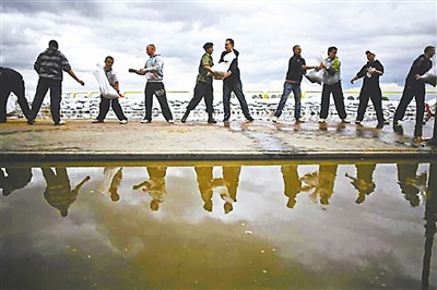 持续强降雨造成波兰主要河流维斯瓦河和奥得河出现险情,从南至北流经波兰全境的维斯瓦河的水位上涨为160年来所罕见。洪灾已造成15人死亡,数万人被迫转移。图为25日波兰志愿者参加抢险,加固河堤。肖劼 供图