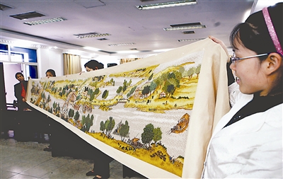 5月27日,杨小伟介绍其新近完成的十字绣作品《清明上河图》。
