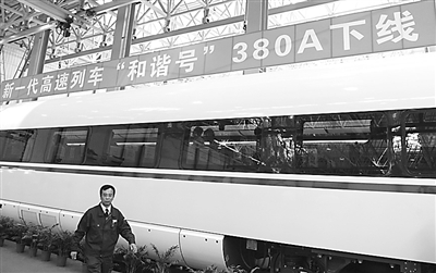 5月27日,新一代高速列车“和谐号”380A首辆车在中国北车长春客车股份有限公司竣工下线。拥有自主知识产权的“和谐号”380A持续运营时速350公里,其利用的先进的隔声减振技术和强动力绿色牵引系统不仅让列车能够平稳低噪运营,同时更加节能环保。新华社记者 蒋林 摄