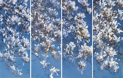 靳之林开创了油画四条屏的探索,把他对于自然的热爱,抒发为对生命绽放的歌颂。他画各种盛开的花卉,以及“寒来暑往”四时的变迁景观。靳之林在油画里用笔很自然,笔未到气已相接,每下一笔和气要连接、贯通,他在画荷花时,感觉普通油画尺幅不足以贯气,荷秆延伸,接天接地,无意中画幅尺寸成了国画中四尺整纸的条幅。
