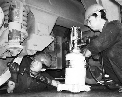 对机车各部位轴承做油润保养,用天平称重确定加油量的多少——5月26日当天,武昌南机务段检修车间走行组职工张竞(左)和胡斌经反复测试机车各部件轴承的用油量与风动压油枪压油次数后,借助天平称重做到了精确加油。不仅使油脂过多与过少都会造成轴承发热或烧损的难题迎刃而解,而且还大量节省了用油。袁甫 赵帅民 摄