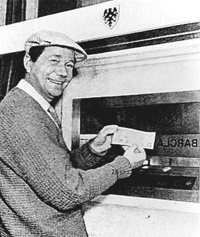1967年6月27日,世界上第一台自动提款机出现在伦敦北部的巴克莱银行门口。人们像观看怪物一样围观,谁也不相信这台其貌不扬的铁壳机器里会吐出英镑。银行老板心里焦急不已,生怕出丑,损害了银行声誉。英国著名电视演员雷吉·瓦尼一心想要制造新闻,成了第一个尝试者。他在众目睽睽之下,把支票放入取款机抽屉,输入个人密码,取款机的另一个抽屉便会开启,提供10英镑面额钞票。至此,自动提款机完成了历史上第一次完美表演。