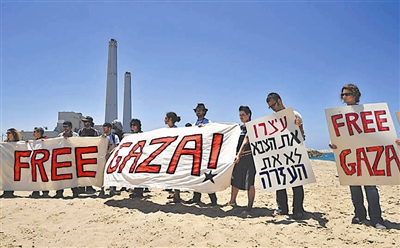 5月31日,在以色列南部城市阿什杜德的港口附近,人们举着标语牌抗议以军方拦截救援加沙的船队。新华社记者 殷博古 摄