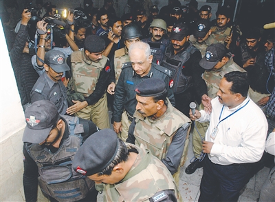 6月1日,在巴基斯坦东部城市拉合尔,警方人员进入遭恐怖袭击的真纳医院。
