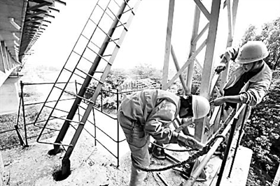 6月3日,中铁电气化局西安电气化公司的施工人员正在向莆铁路东新赣江特大桥调整桥钢柱。