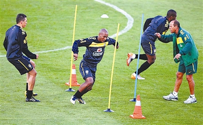 6月3日,南非约翰内斯堡,巴西队继续备战,气氛轻松,卡卡弹巴普蒂斯塔笑开怀。