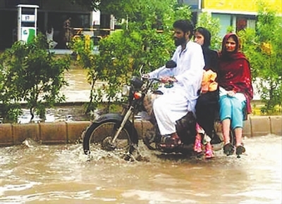 以170公里时速移动的风暴“钻石”6月6日袭击了巴基斯坦港口城市卡拉奇。图为当天在卡拉奇,一家人骑着自行车行进在被水淹没的街道上。阿健 供图