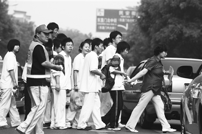 6月7日上午,北京东直门中学门口,前来参加2010年全国普通高校招生考试的学生在老师的带领下穿越马路前往考场。本报记者 杨登峰 摄