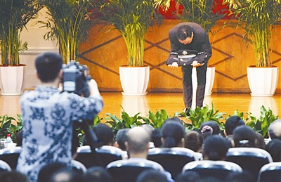 6月7日,重庆渝北区举行公正廉洁执法教育警示会。原市局刑警总队二支队副支队长郑某手托警服警帽向全场鞠躬。当日,重庆市公安局召开公正廉洁执法警示教育报告会,3名曾经“有问题”的警察现身说法,讲述了自己怎样从一名光荣的人民卫士沦为了阶下囚,无尽忏悔之情溢于言表,震撼人心。 杨帆 摄