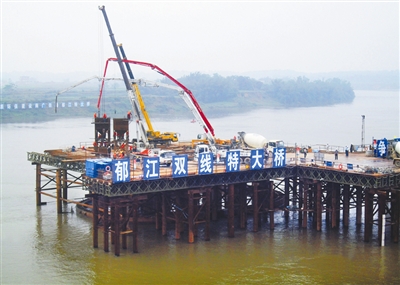 位于广西境内的南广铁路郁江特大桥全长11.328公里,主桥的283号墩、284号墩位于郁江中,直径2.5米的钻孔桩有40根,需要灌注混凝土5600立方。正常水位施工水深接近20米,两墩塔身高度达到103.5米,工程技术含量高,施工难度大。中铁三局五公司南广项目部多次邀请专家、组织工程技术人员对封底方案进行反复论证,确定采用C40砼、一次拔球的方法,连续灌注水下混凝土。(孙清华 李志勇摄影报道)