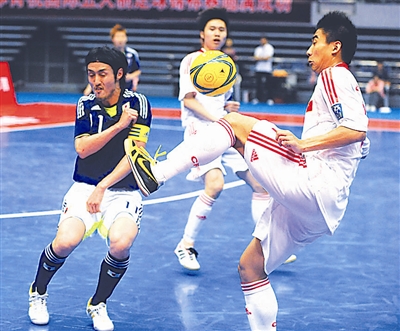 6月8日,中国队球员张啸(右)在比赛中停球。当日,室内五人制足球国际锦标赛在杭州举行,中国队在首场比赛中以1比7不敌日本队。 新华社记者 徐昱 摄