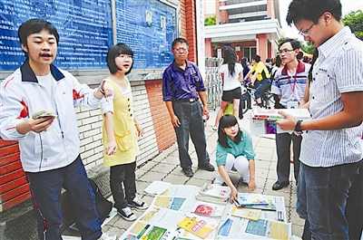 6月8日下午,在四川省内江市第六中学考场外,刚刚结束高考的部分考生正在叫卖高考复习资料。当日下午5时,四川省等14个省区市的高考同时结束,四川省内江市第六中学部分考生自发摆开地摊,以1元至5元不等的低价高声叫卖《状元之路》等高考复习资料,吸引了不少高中生驻足选购,既给自己增加一笔收入,又实现了“课本循环利用”。兰自涛 摄