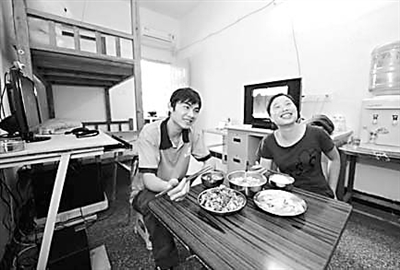 6月6日,来自河南的25岁外来工田亚涛和妻子在企业零租金夫妻房内吃饭,房内卫生间、空调、热水器等生活设施齐全。