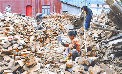 福州市仓山区一处民房被推倒后,一些手持铁镐、瓦刀等工具的人开始从土堆里将实心黏土砖、木梁柱等旧建材挖出(5月8日摄)。