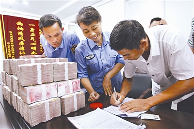 6月9日下午4时,上百名农民工高兴地领回了某工程项目所欠的601万元血汗钱。据了解,今年5月18日,在三亚市红沙地区一幢在建的15层大楼突然停工,155名农民工几个月的工钱一时无法领到。三亚市劳动保障监察支队得知此消息后立即成立了调查组,并与有关部门进行沟通,很快农民工们领到了属于自己的工钱。 孙清 摄