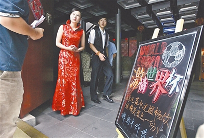 6月10日,在北京一家酒店门口,商家推出有关世界杯促销的海报以招揽顾客。