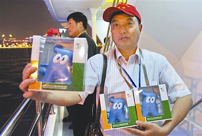 安徽省池州市的汪赛琪参观世博会后,一下买了8个“四海之宝”吉祥物,他说“把这些吉祥物带给我的同事们”。