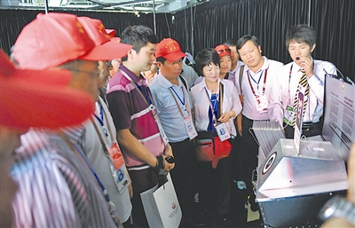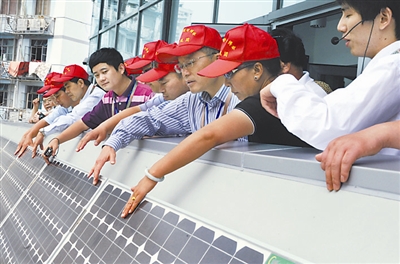 在世博园城市最佳实践区,太阳能板引起了劳模们的极大兴趣。