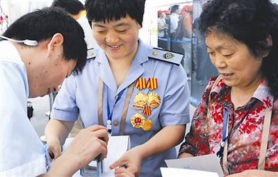 安徽省蚌埠市长途汽车中心站班长余瑞青要把世博会上的纪念品带回班组,与工友们分享快乐。