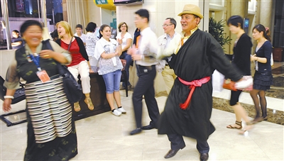 西藏白朗县曲奴乡的农民工劳模普布索朗第一次到上海,在世博园里,他激动地跳起了藏族舞蹈。