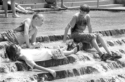 6月9日,在乌克兰首都基辅,几名儿童在市中心人造喷泉边玩耍纳凉。当天,基辅迎来高温天气。预计未来几天该市天气仍将非常炎热,在乌克兰东部和南部气温将达到34摄氏度。新华社发 斯塔拉斯坚科 摄