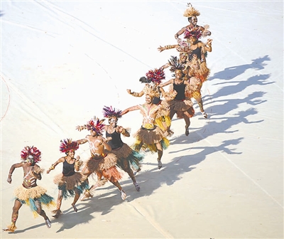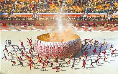 下午两点,世界杯开幕式准时举行。伴随着被曼德拉授予“桂冠诗人”称号的非洲著名诗人佐拉尼·姆吉瓦用南非豪萨语发出的“非洲召唤”,象征着足球城之外其余9个世界杯球场的9条人链彩带逐渐向球场中心延展,270名女演员齐声合唱着非洲民谣,现场气氛渐近高潮……