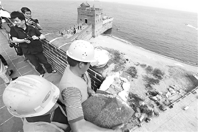 6月12日是世界遗产日,在我国重点文物保护地山海关古城的老龙头长城风景点上,文物保护单位的专业职工正在科学而精心地维护着这段古长城。据了解,为了科学地保护好山海关这个古今名胜之地,自2004年起我国投资两亿多元进行了全面系统的保护和恢复性维修。本报记者 于文国 摄