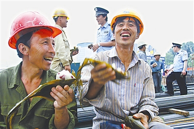 6月13日,辽宁省丹东市一建筑工地,农民工在品尝民警送来的粽子。端午节即将到来,丹东市公安局振兴分局纤维派出所开展“爱心粽子进工地”走访慰问活动,民警走进辖区建筑工地为农民工送去粽子,使他们感受到第二故乡的温暖。 蔡 冰 摄