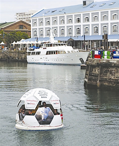 6月12日,“足球船”在维多利亚港湾中穿行。在开普敦的旅游胜地维多利亚湾,一艘足球造型的游船成为游客们的最爱,它一次可以载6至8名游客。 新华社发