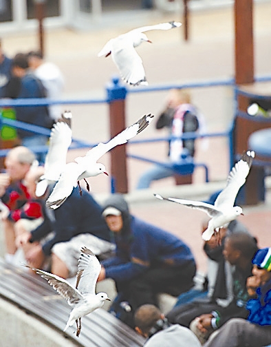 6月12日,几只海鸥在看台上空飞舞。在开普敦旅游胜地维多利亚湾的球迷观赛场,一群海鸥也为世界杯的举行而痴狂。为了能从观赛的球迷手中得到食物,海鸥们有的在球迷看台上漫步,有的在球迷头顶滑行,有的夺食而去,还有的则被精彩刺激的比赛画面吸引,在屋顶专心致志地看比赛。 新华社记者 杨磊 摄