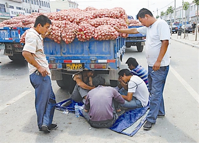 南店子市场上的蒜商,每年从蒜农手里收购大蒜,然后扎堆到一起,翘首期待着全国各地的大商户来收购蒜,从中赚取差价。由于近期观望的人多,买的人少,他们有的翘腿坐在车上休息、玩手机;有的躺在车底阴凉处睡觉;还有的三五结伴打扑克牌来消磨时间;最苦的要数那些带着孩子的妈妈了……由于大蒜的价格极不稳定,好的时候能很快出手,一车蒜能赚上四五百块钱,行情不稳的时候,好几天都卖不出去,甚至倒赔钱,风险大,蒜商在“赌”。