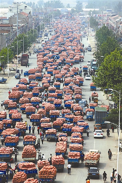 6月6日,在山东金乡的南店子市场,近千辆满载着大蒜的农用三轮车停靠在公路中间等待交易,车挨着车,蒜挤着蒜,形成了一条长达2公里左右的“巨龙”,场面极为壮观。就是这个不起眼的地方,在圈内名声却是响当当的,被戏称为“大蒜华尔街”。