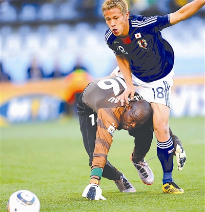 日本队球员本田圭佑(上)与喀麦隆队守门员苏莱曼努在比赛中拼抢。 前者打入本场比赛的唯一进球,帮助日本队获胜。新华社记者 李尕 摄