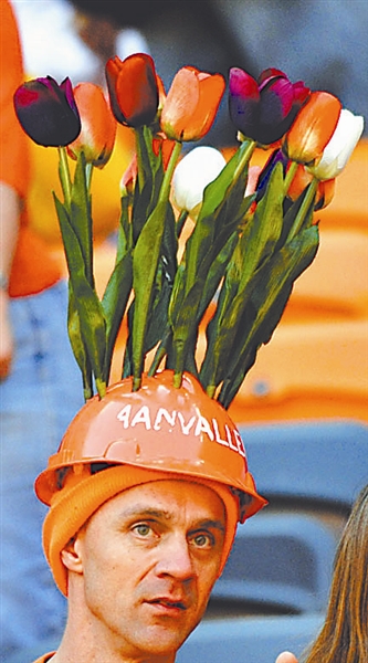 6月14日,“头戴”郁金香的荷兰队球迷在赛前为球队助威。