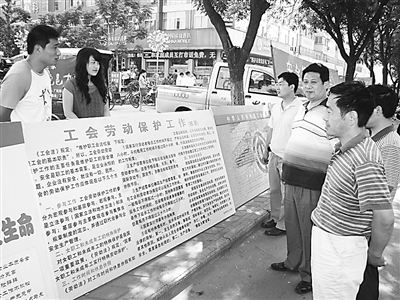 6月13日是“全民安全教育日”,河南汝州市总工会联合有关部门举行集中宣传活动,全市70余家基层工会和市直单位共同行动,制作宣传版面160余块,在市区主要干道悬挂横幅240余条。图为市总工会制作的安全生产、劳动保护宣传版面,吸引了众多市民驻足观看和咨询。李军现 赵刚 摄